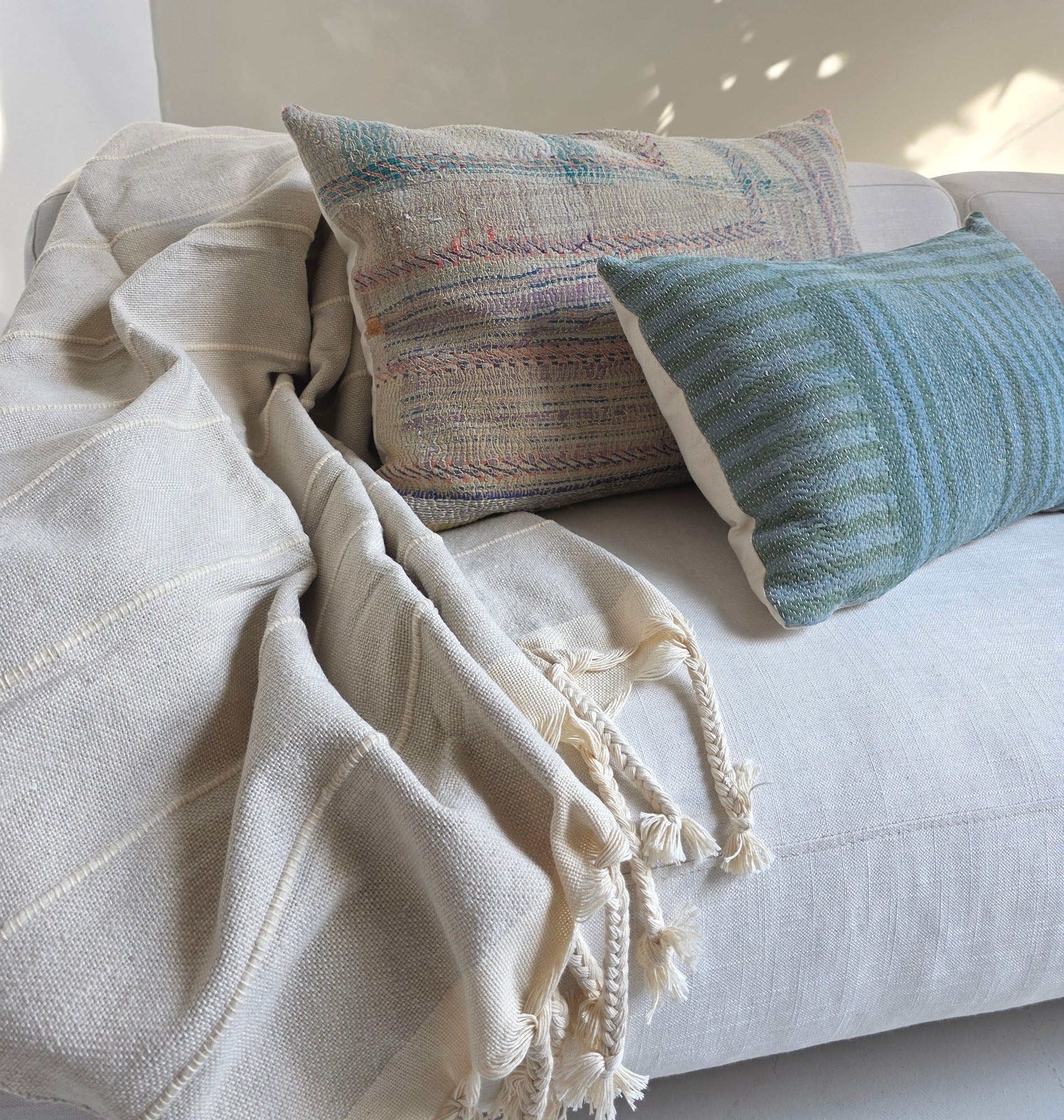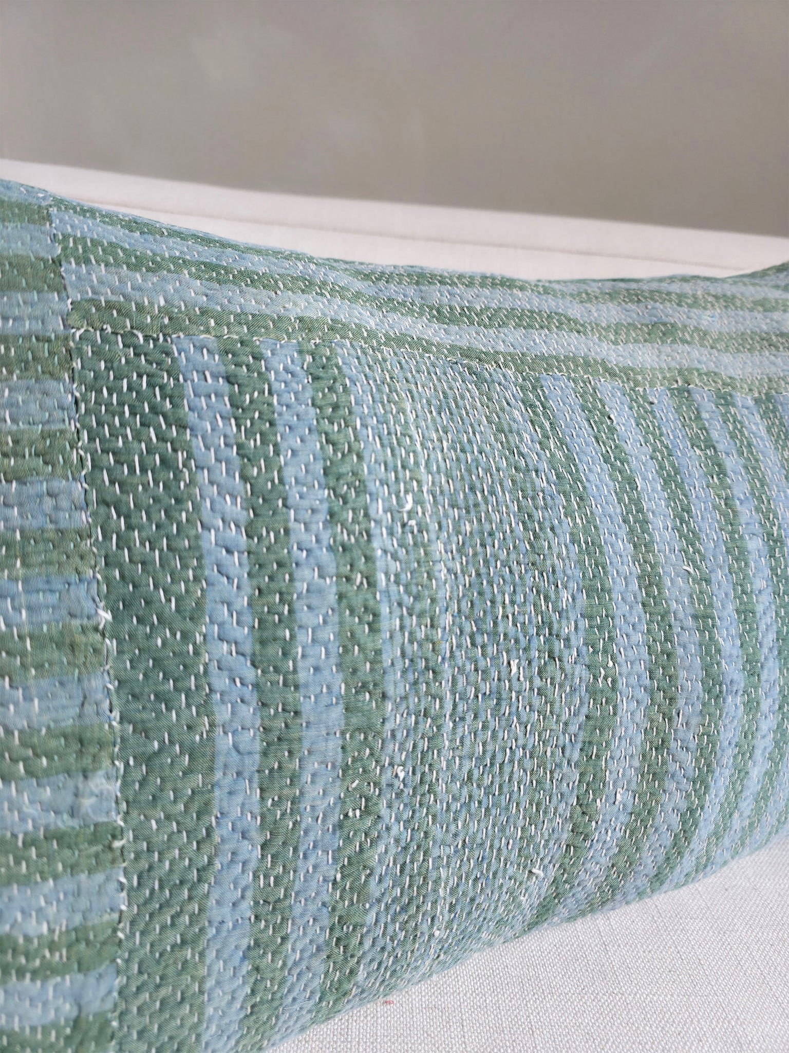 These one of a kind pillows are made from upcycled cotton Kantha quilts. A cool teal and blue stripe featuring textural stitching.
