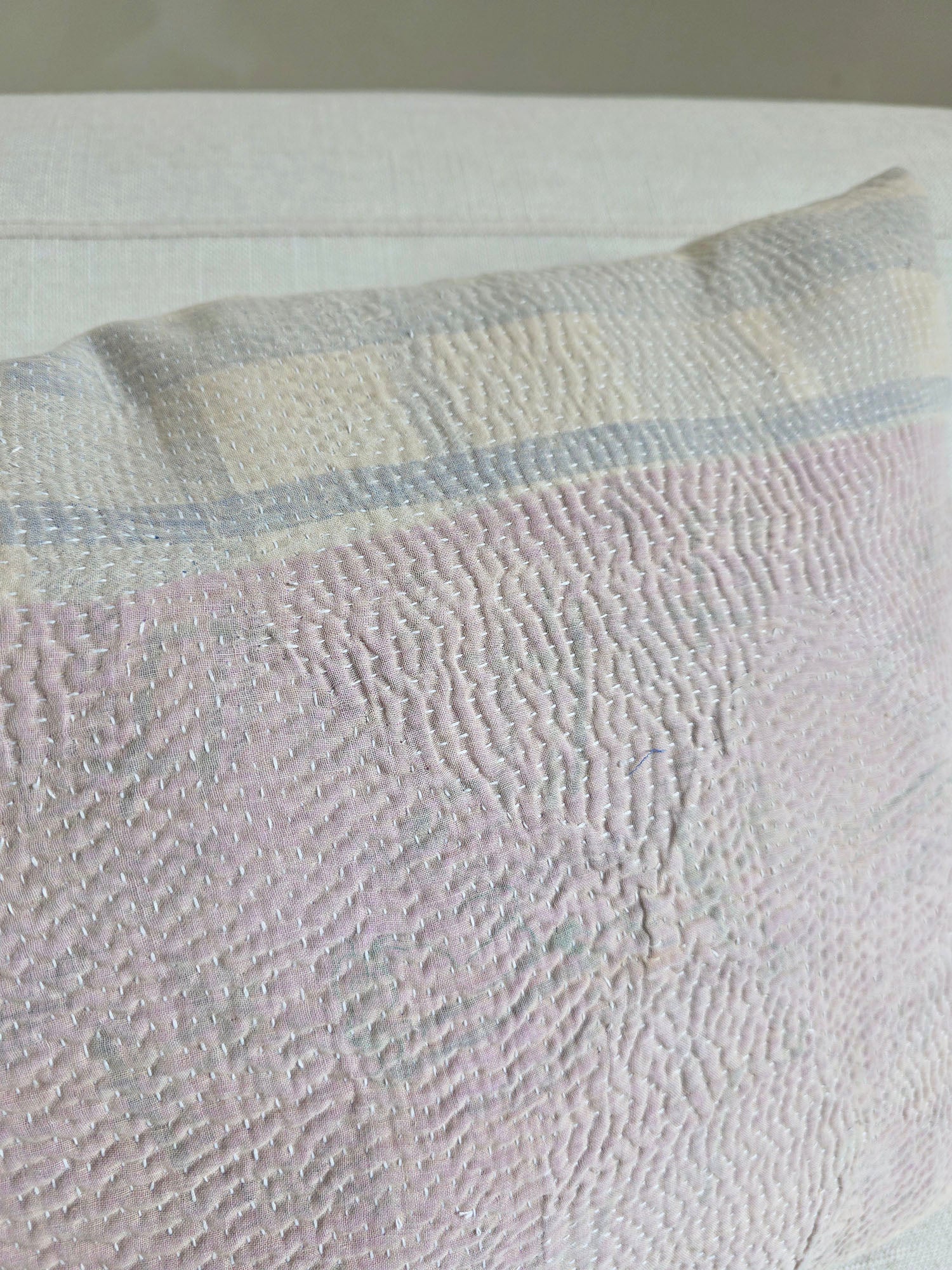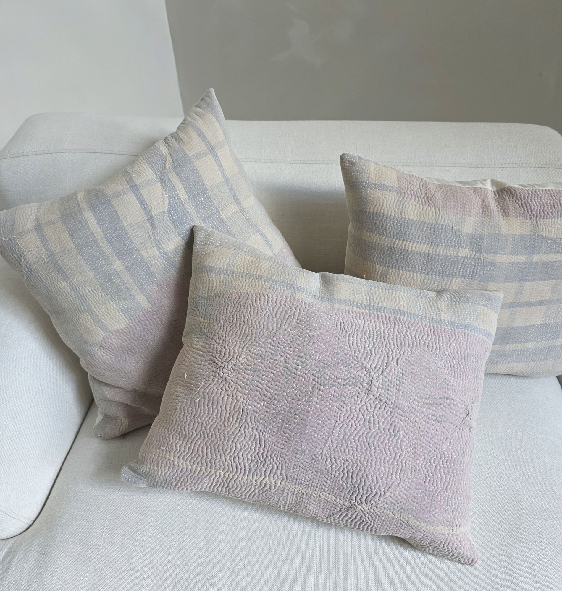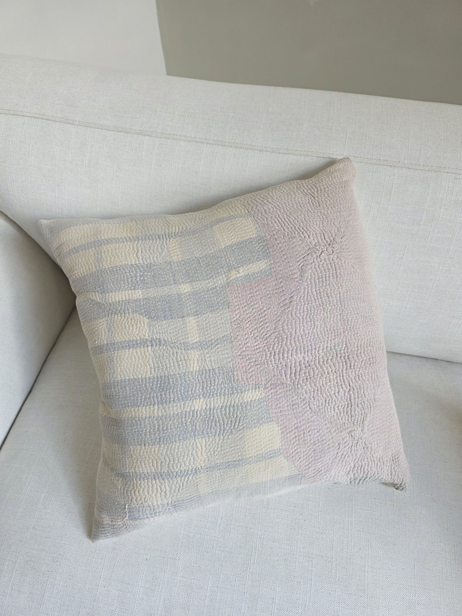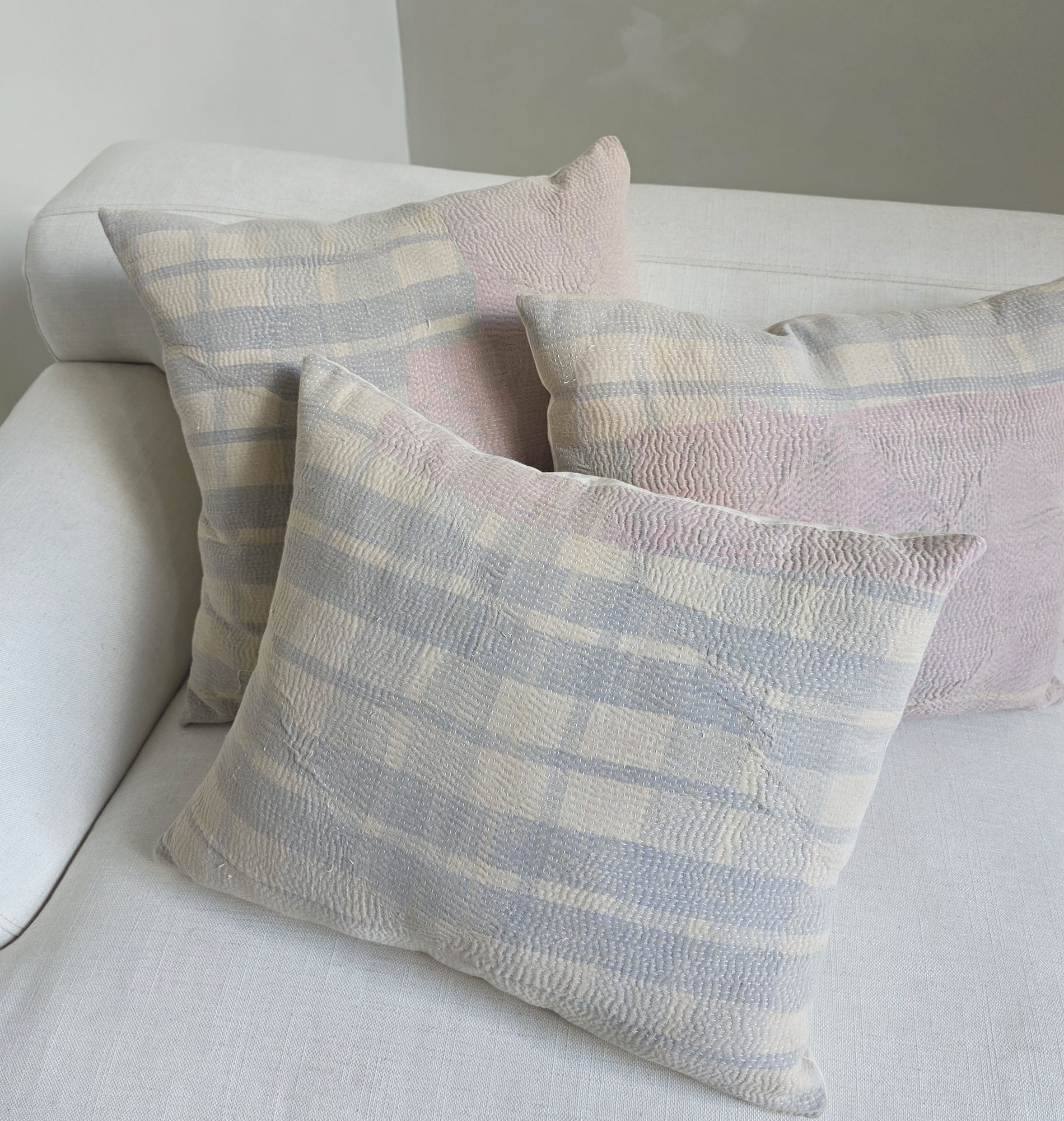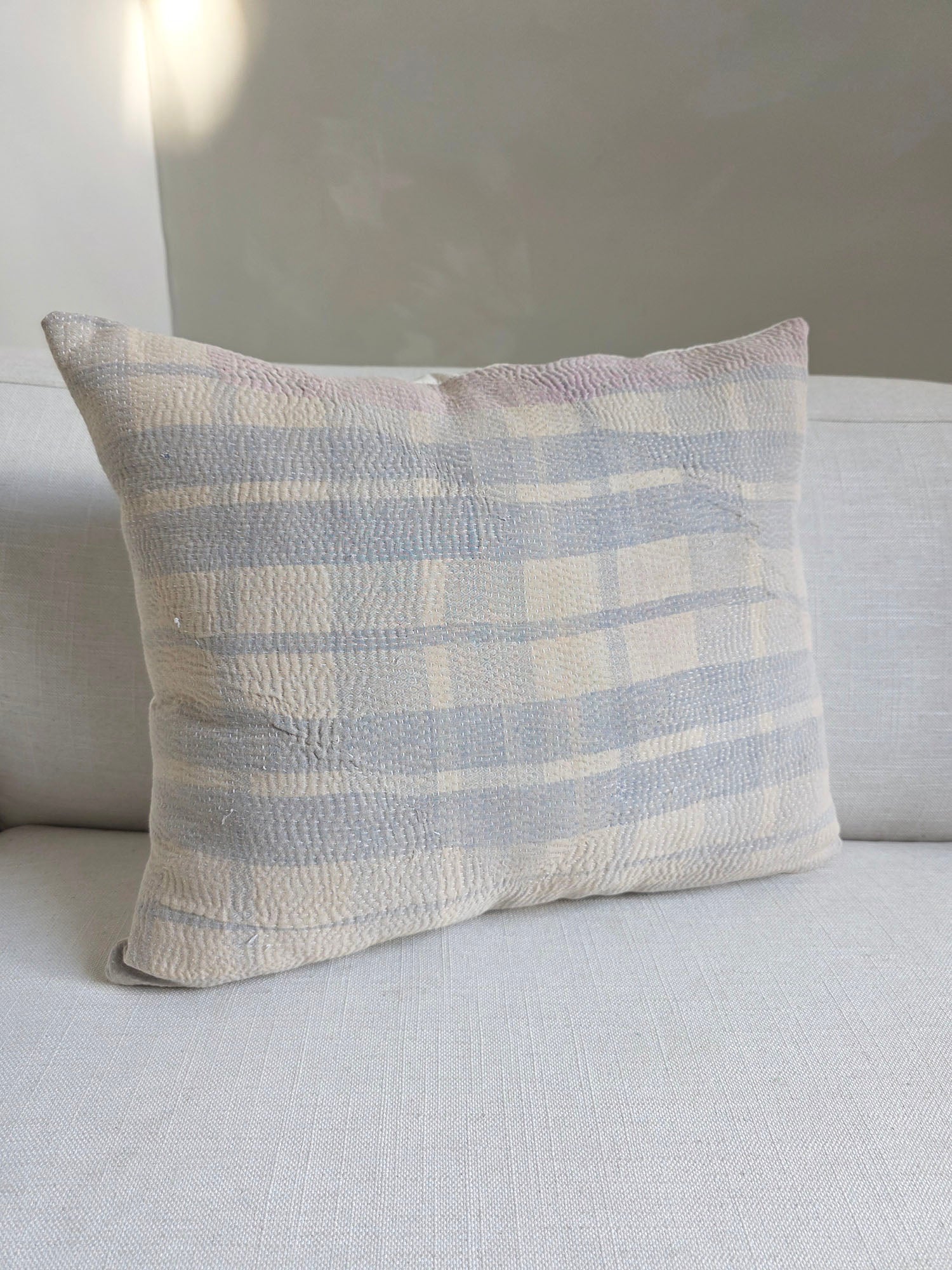 These one of a kind pillows are made from upcycled cotton Kantha quilts. A soft gingham pattern featuring textural stitching.