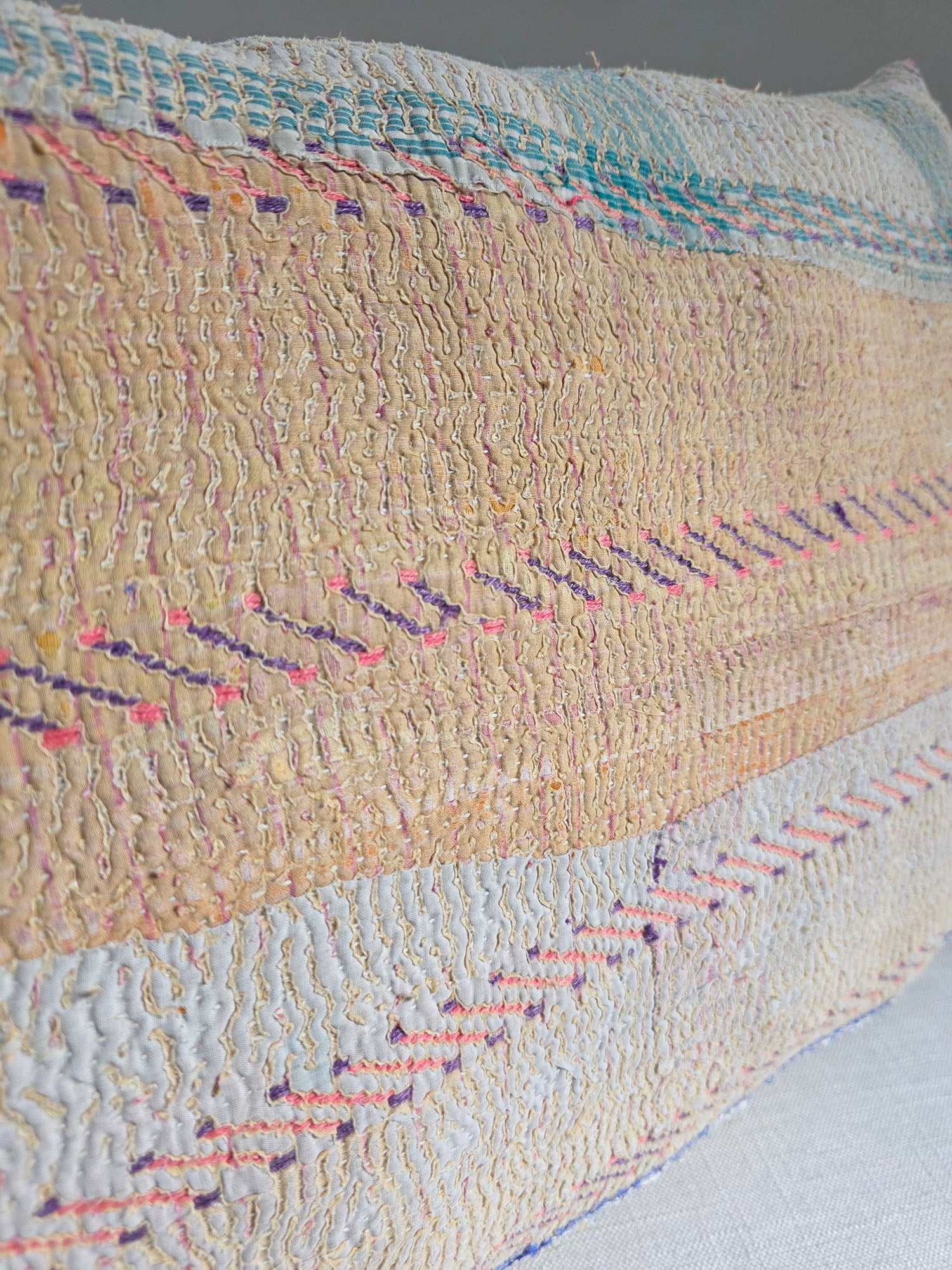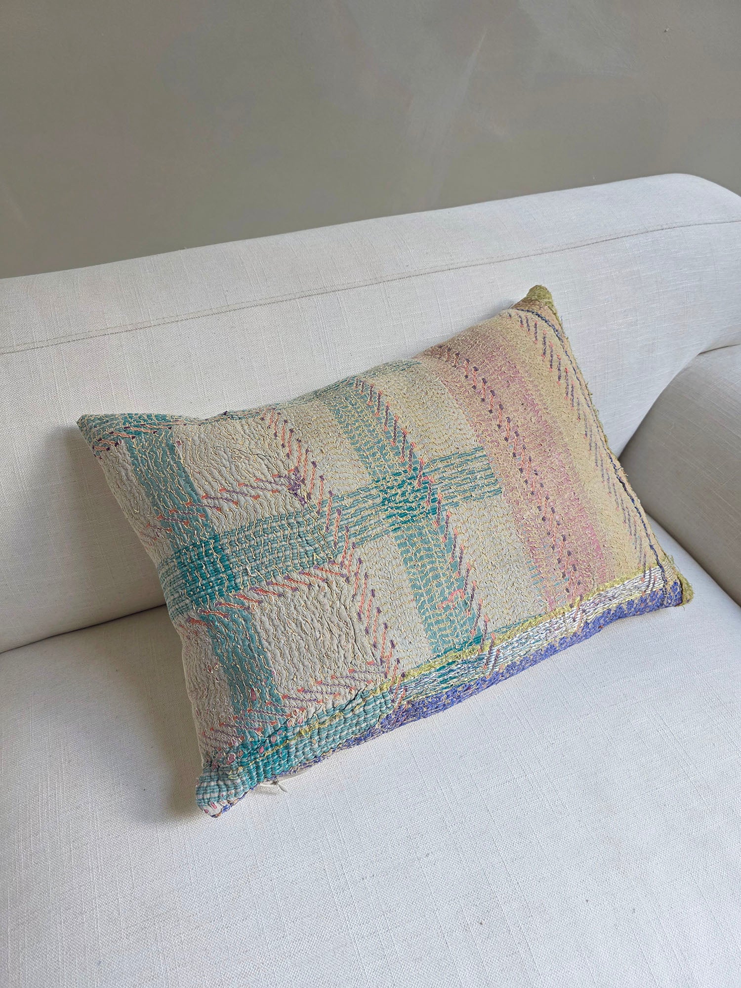 These one of a kind pillows are made from upcycled cotton Kantha quilts. A soft gingham pattern featuring textural stitching.