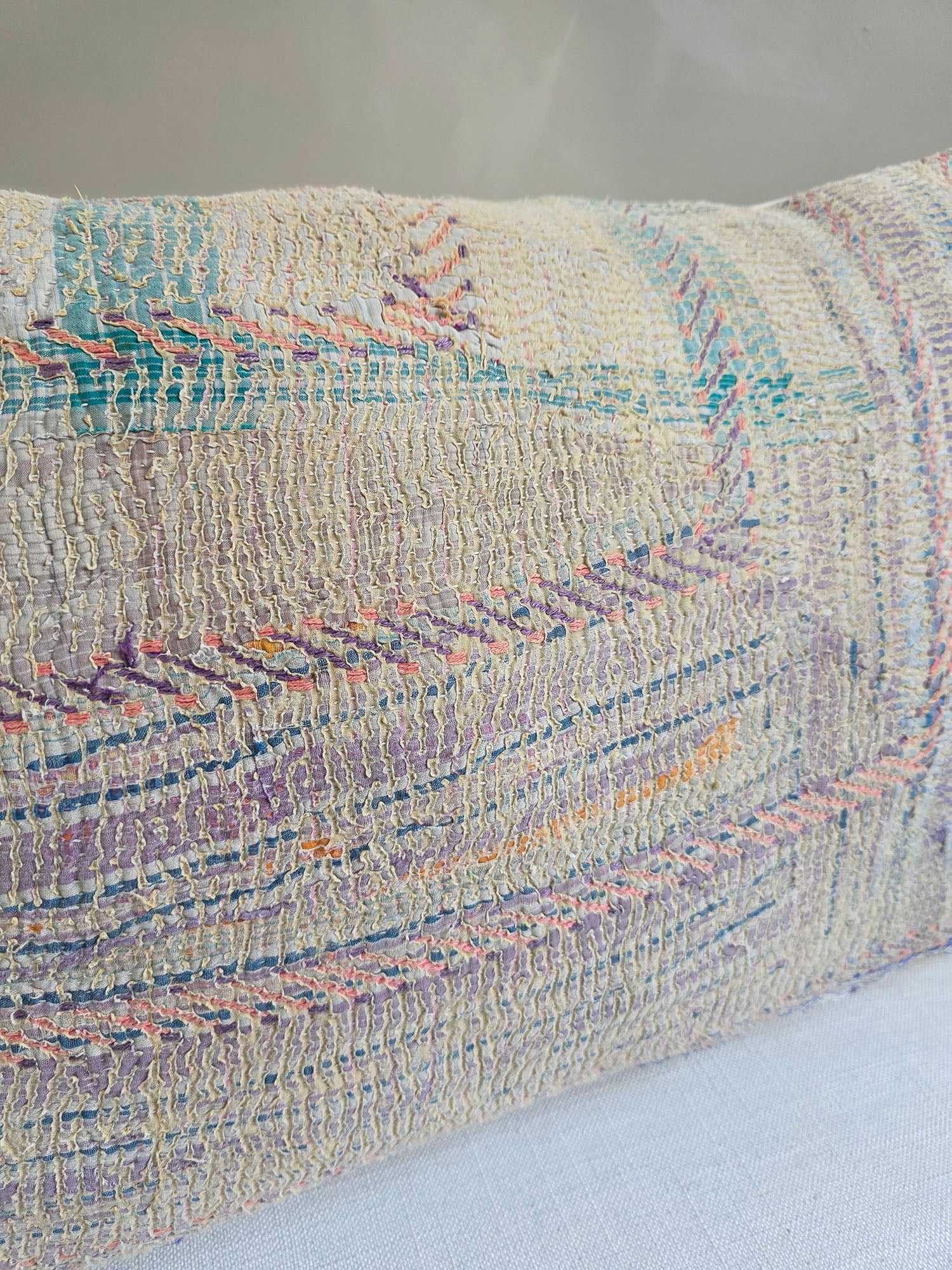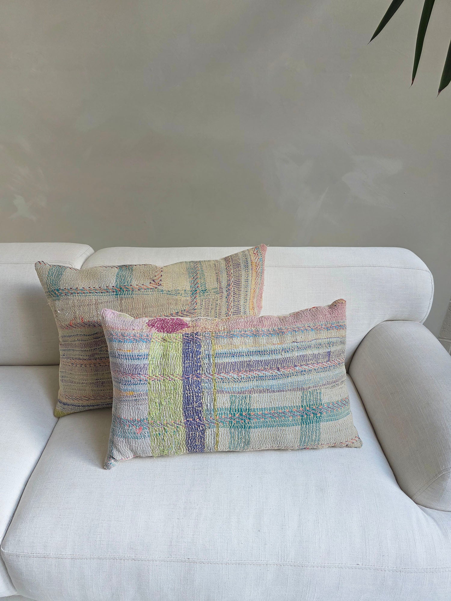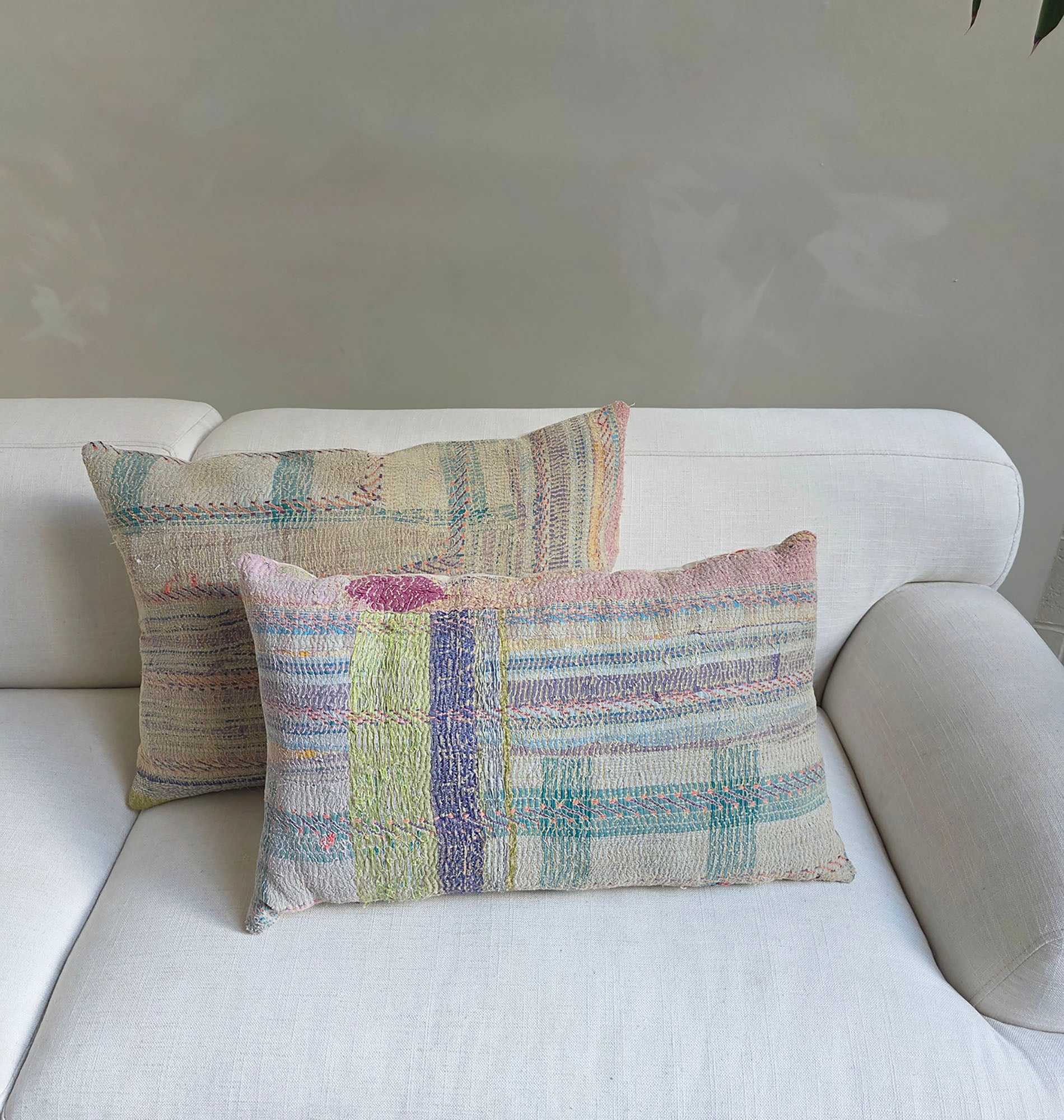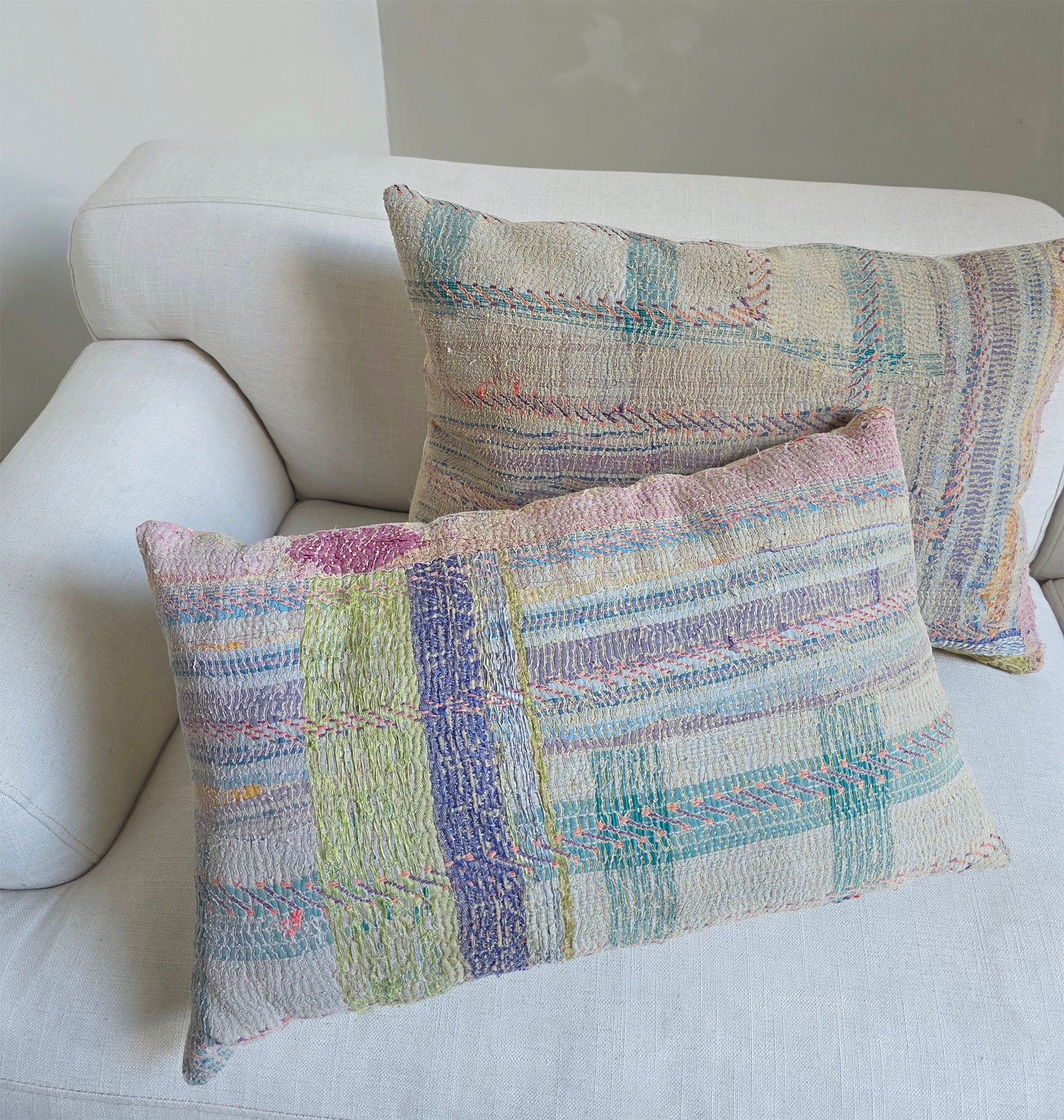 These one of a kind pillows are made from upcycled cotton Kantha quilts. A soft gingham pattern featuring textural stitching.