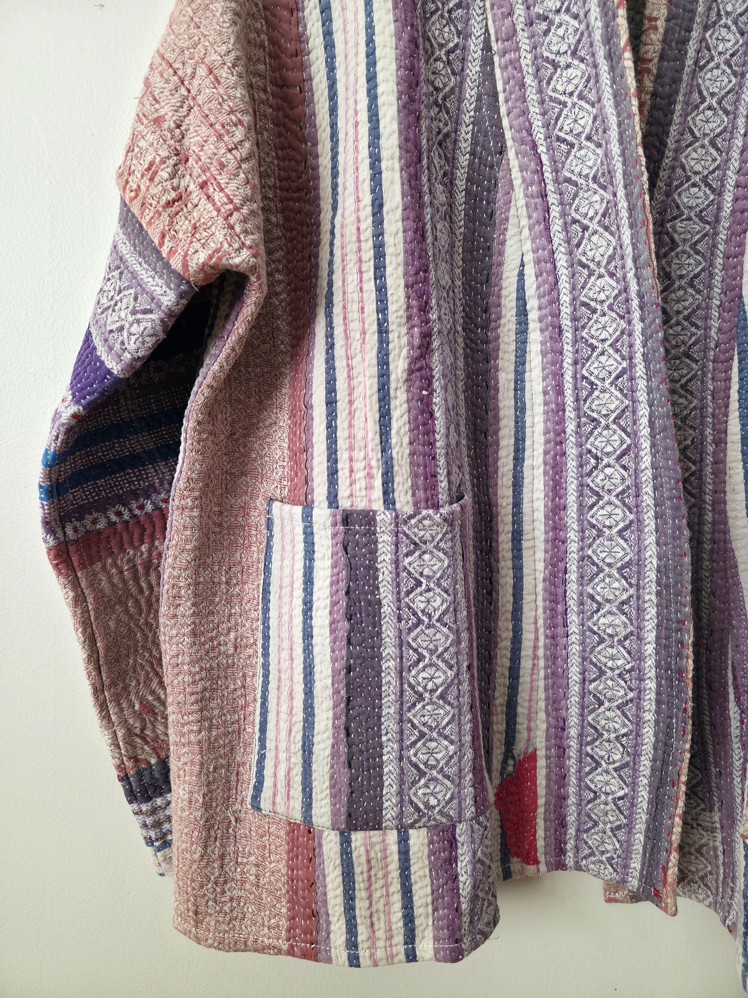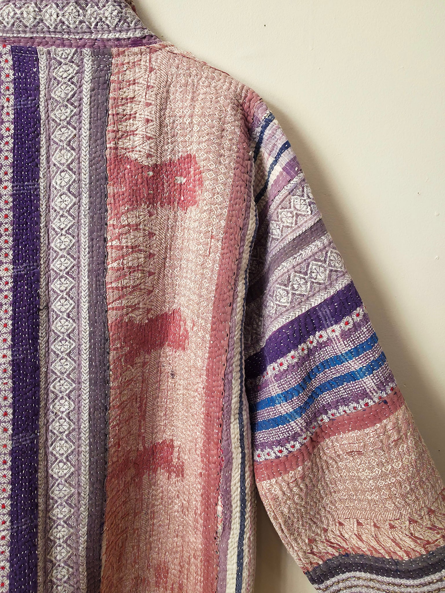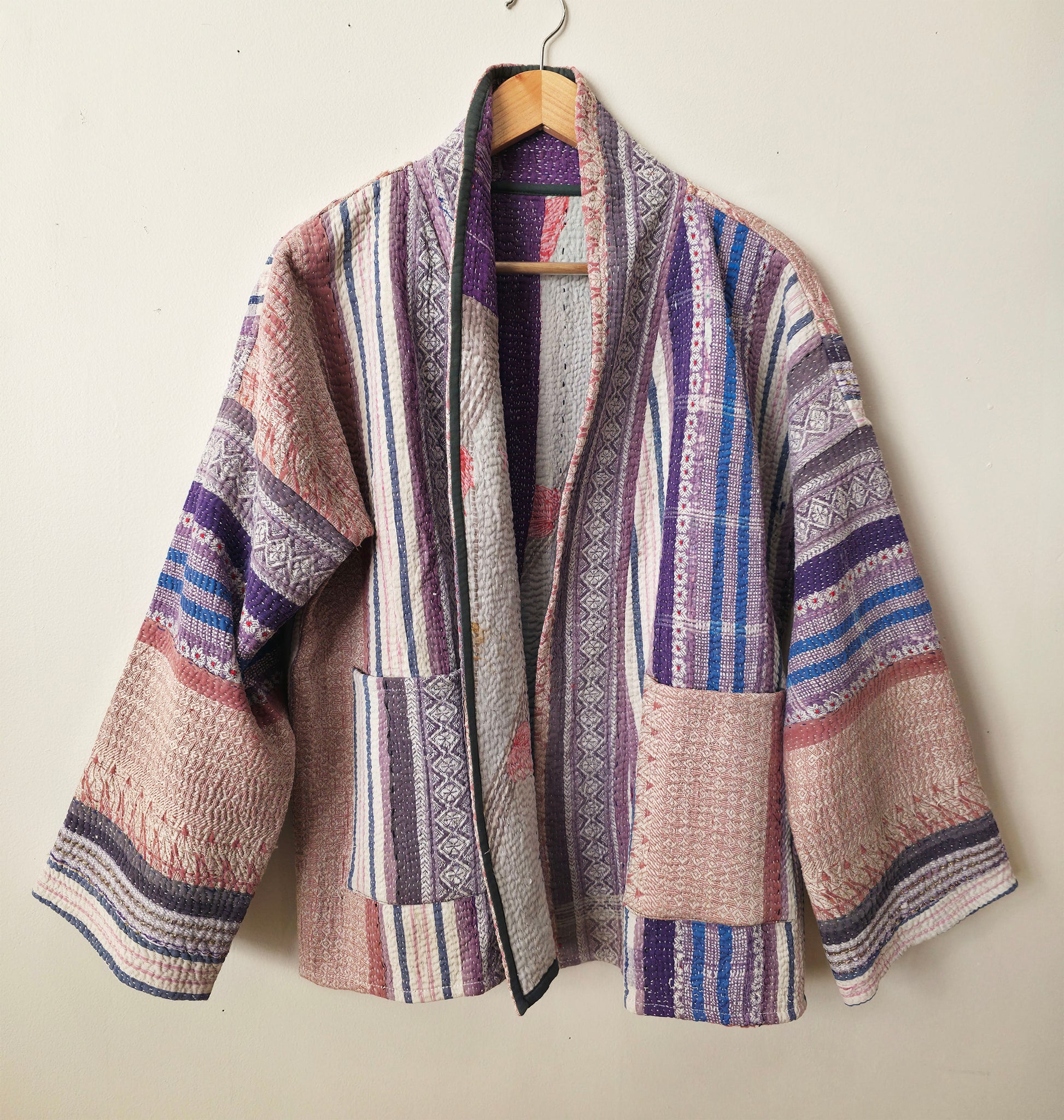 One of a kind, mid-weight jacket made from vintage cotton Kantha. Features a handsewn top-stitch detail for the prettiest texture and lasting durability.