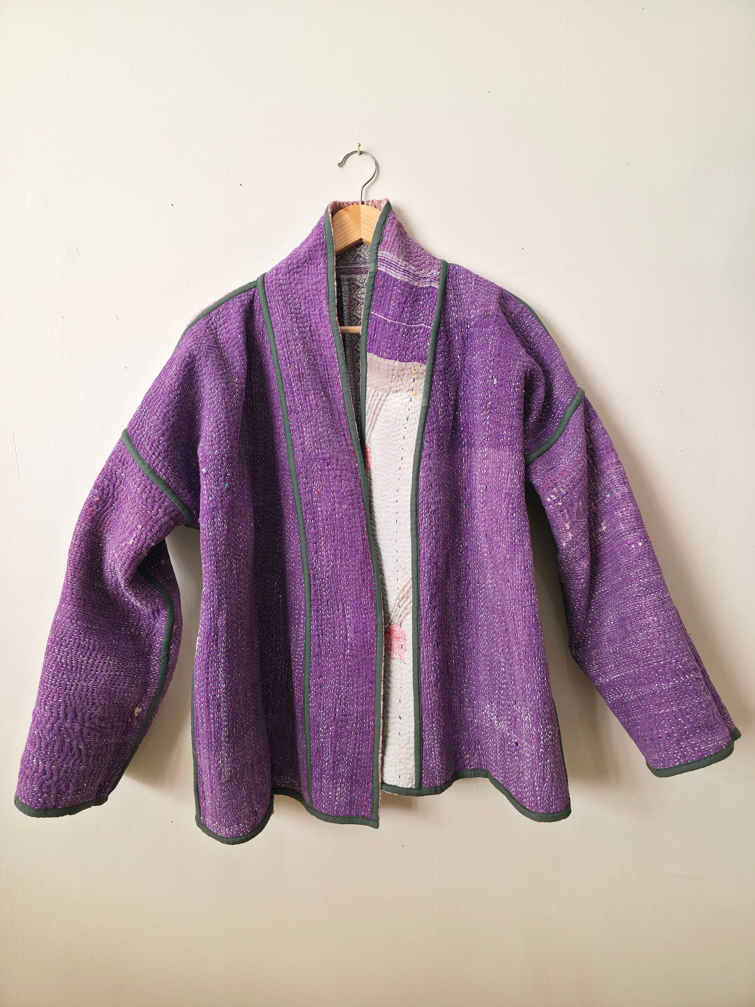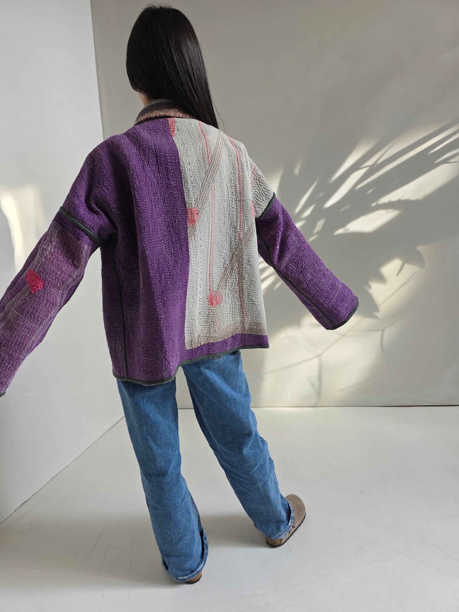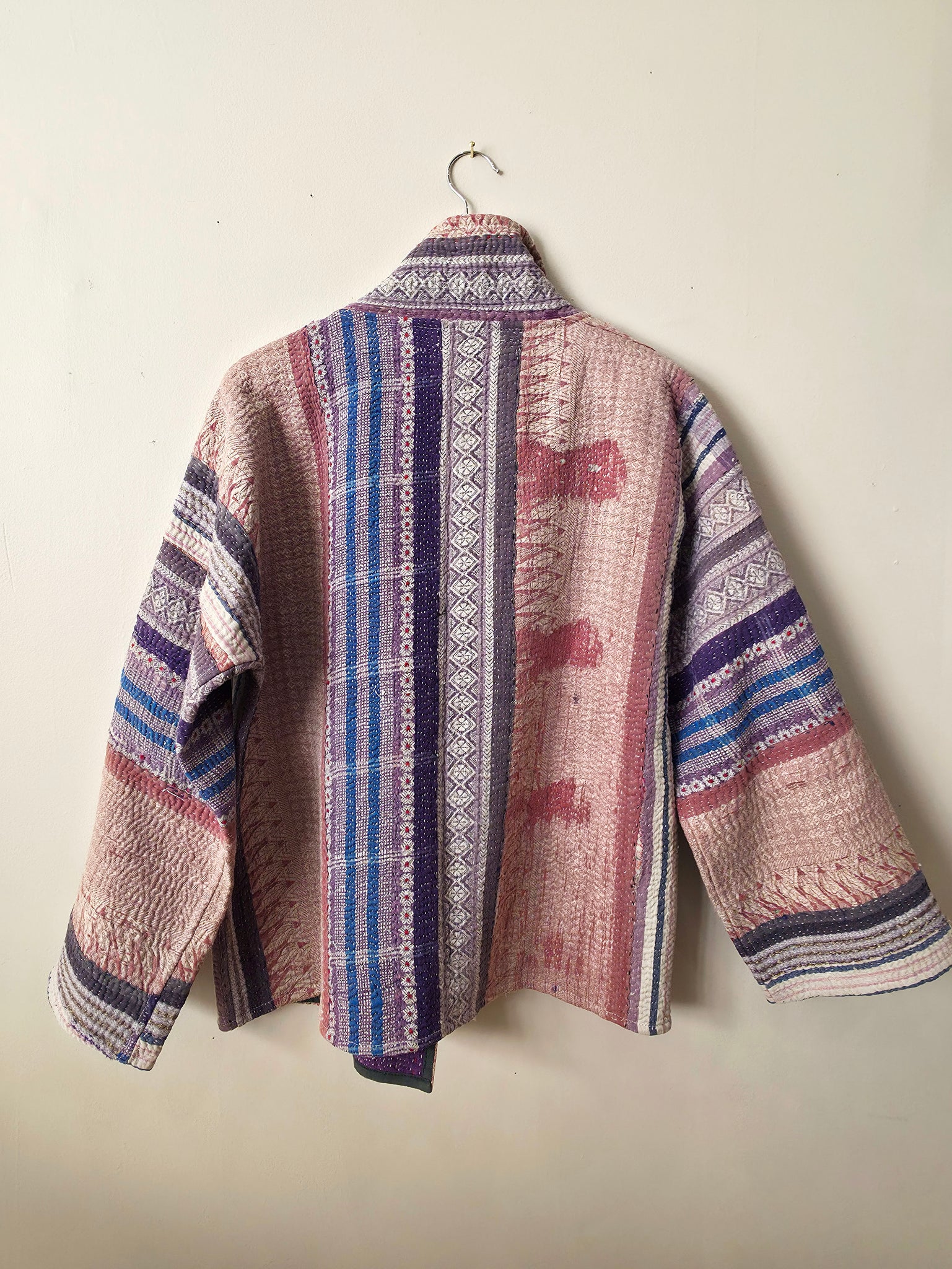 One of a kind, mid-weight jacket made from vintage cotton Kantha. Features a handsewn top-stitch detail for the prettiest texture and lasting durability.