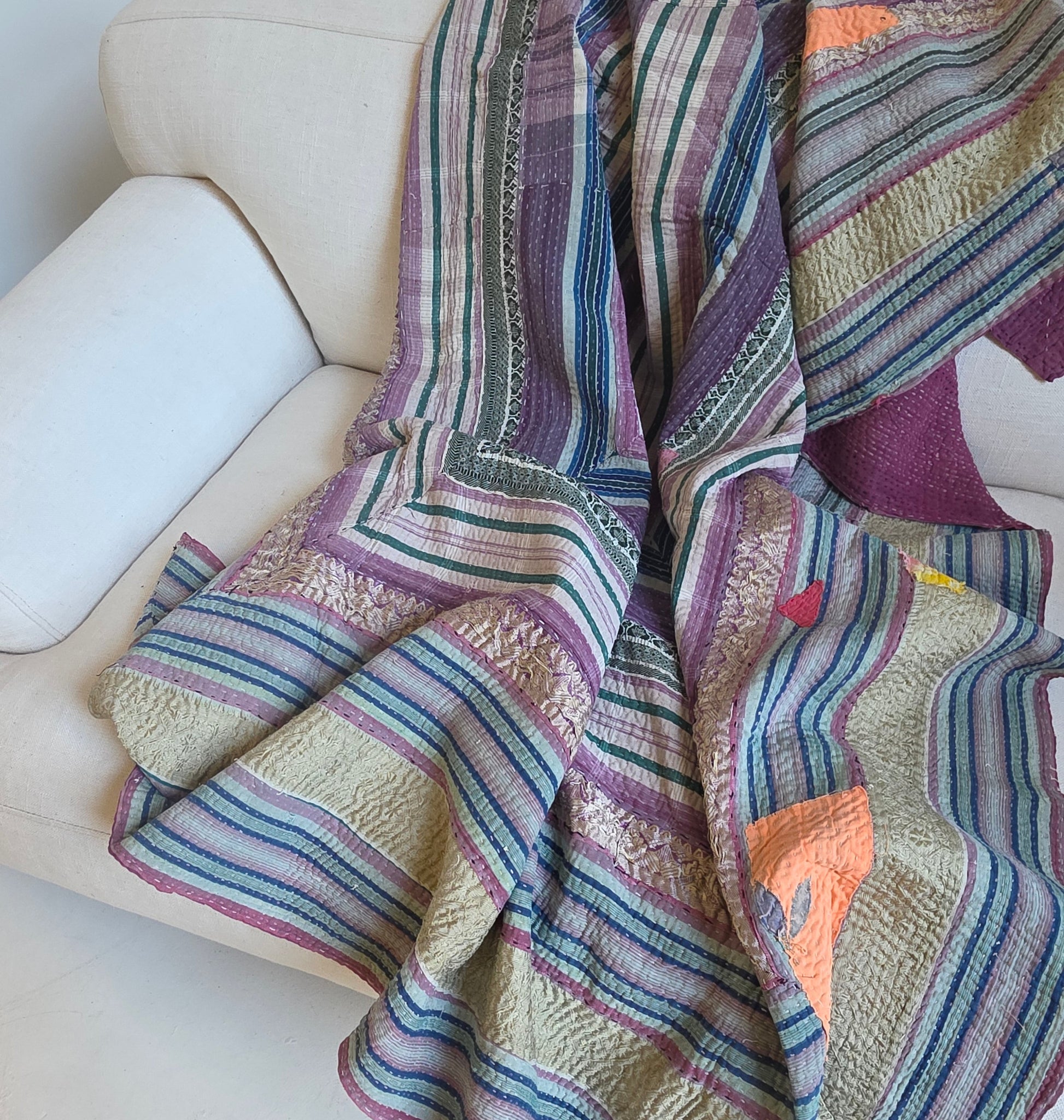 Kantha blankets are made from upcycled textiles quilted together in layered stacks. With age and use the layers wear overtime revealing new colors and patterns from the layer below.