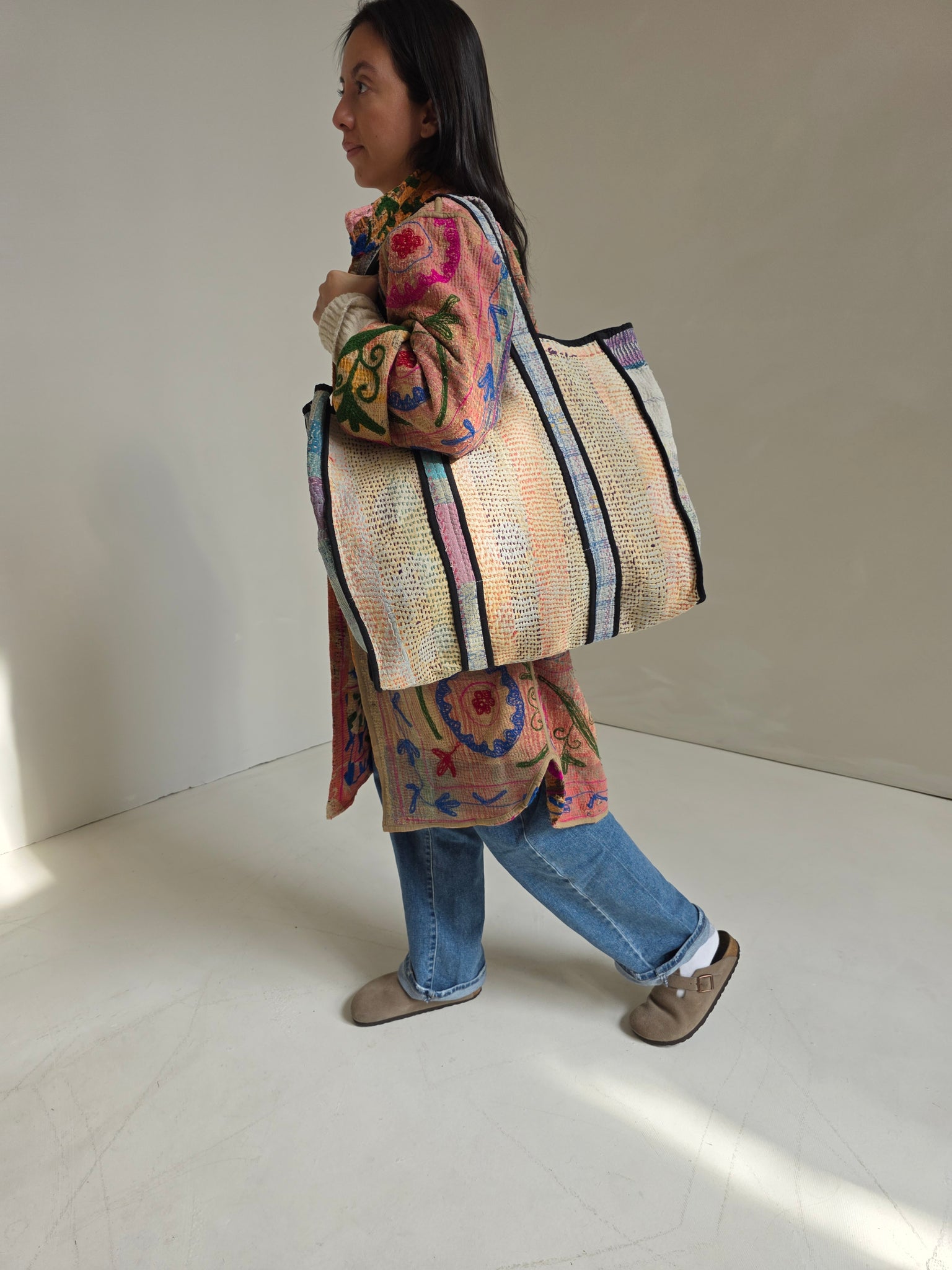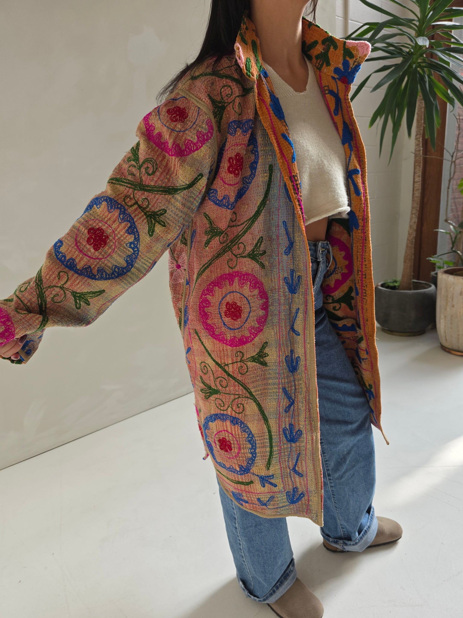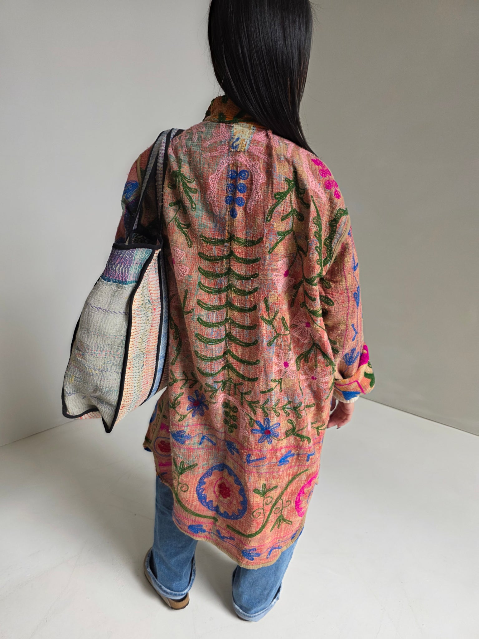 One of a kind, mid-weight jacket made from vintage cotton Kantha. Features a handsewn top-stitch detail for the prettiest texture and lasting durability.
