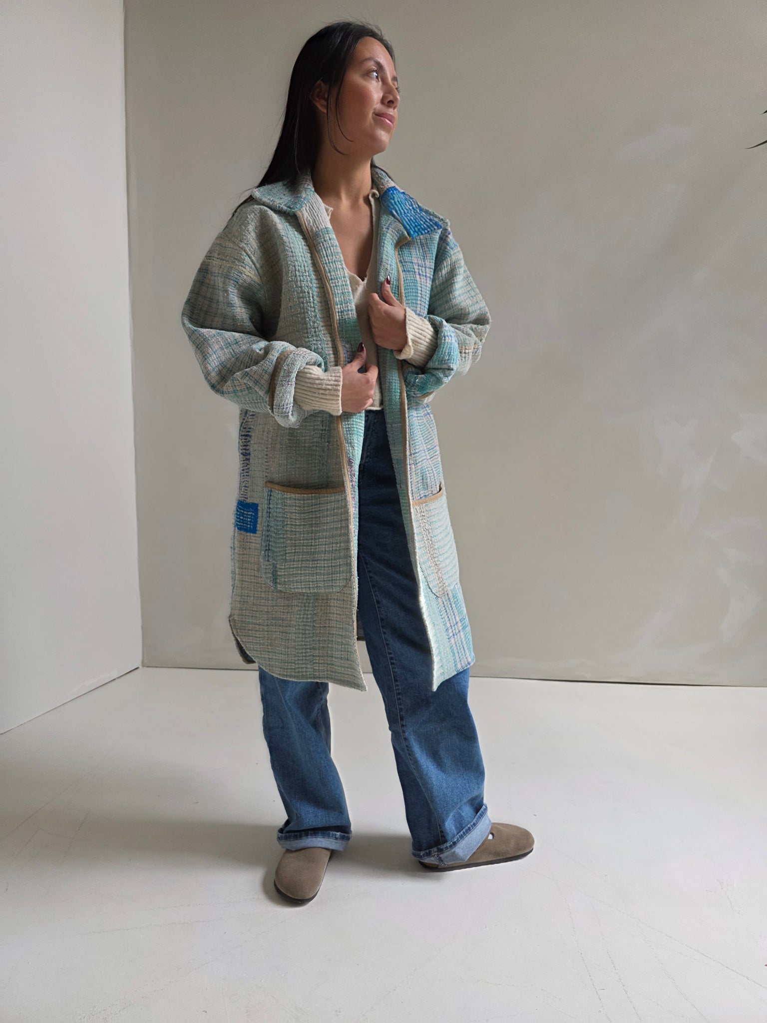 One of a kind, mid-weight jacket made from vintage cotton Kantha. Features a handsewn top-stitch detail for the prettiest texture and lasting durability.
