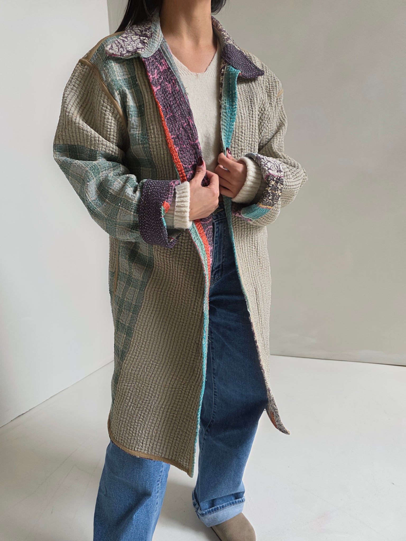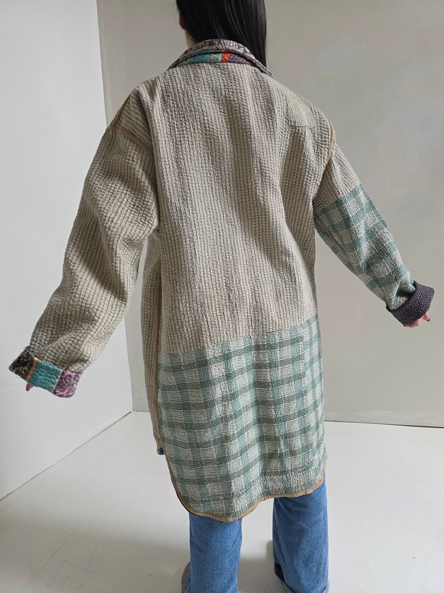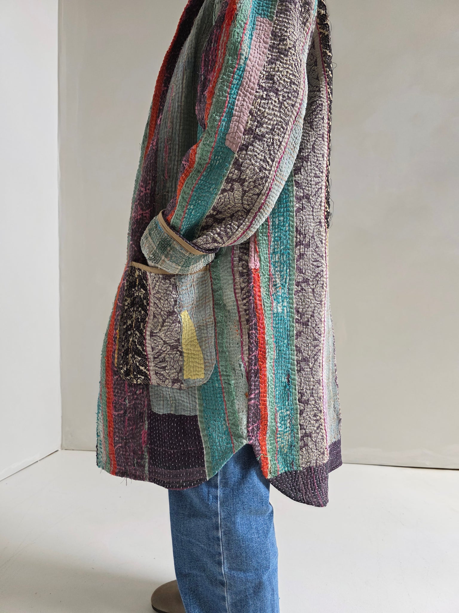 One of a kind, mid-weight jacket made from vintage cotton Kantha. Features a handsewn top-stitch detail for the prettiest texture and lasting durability.