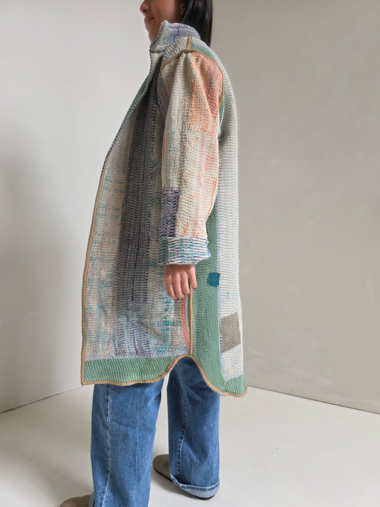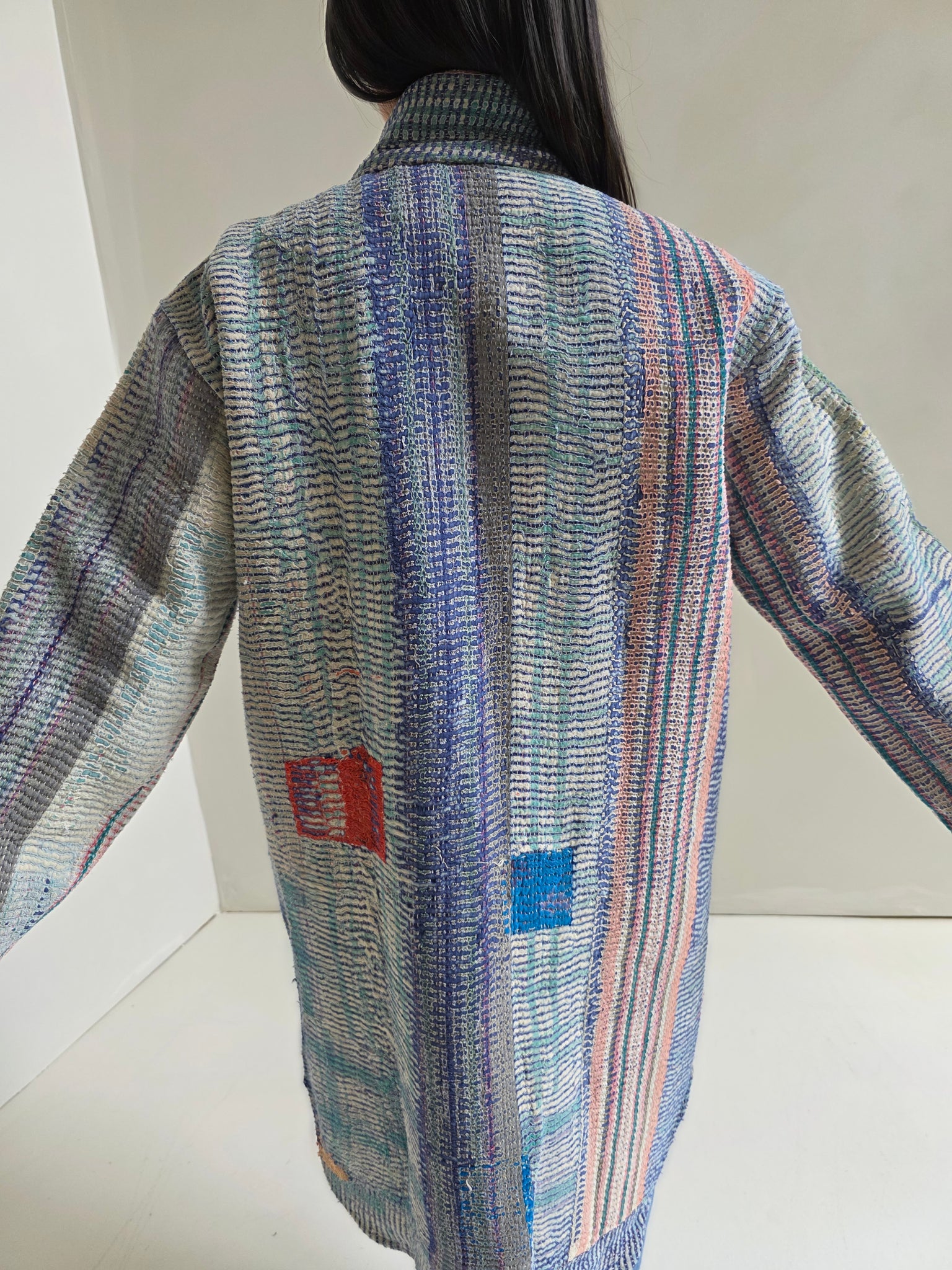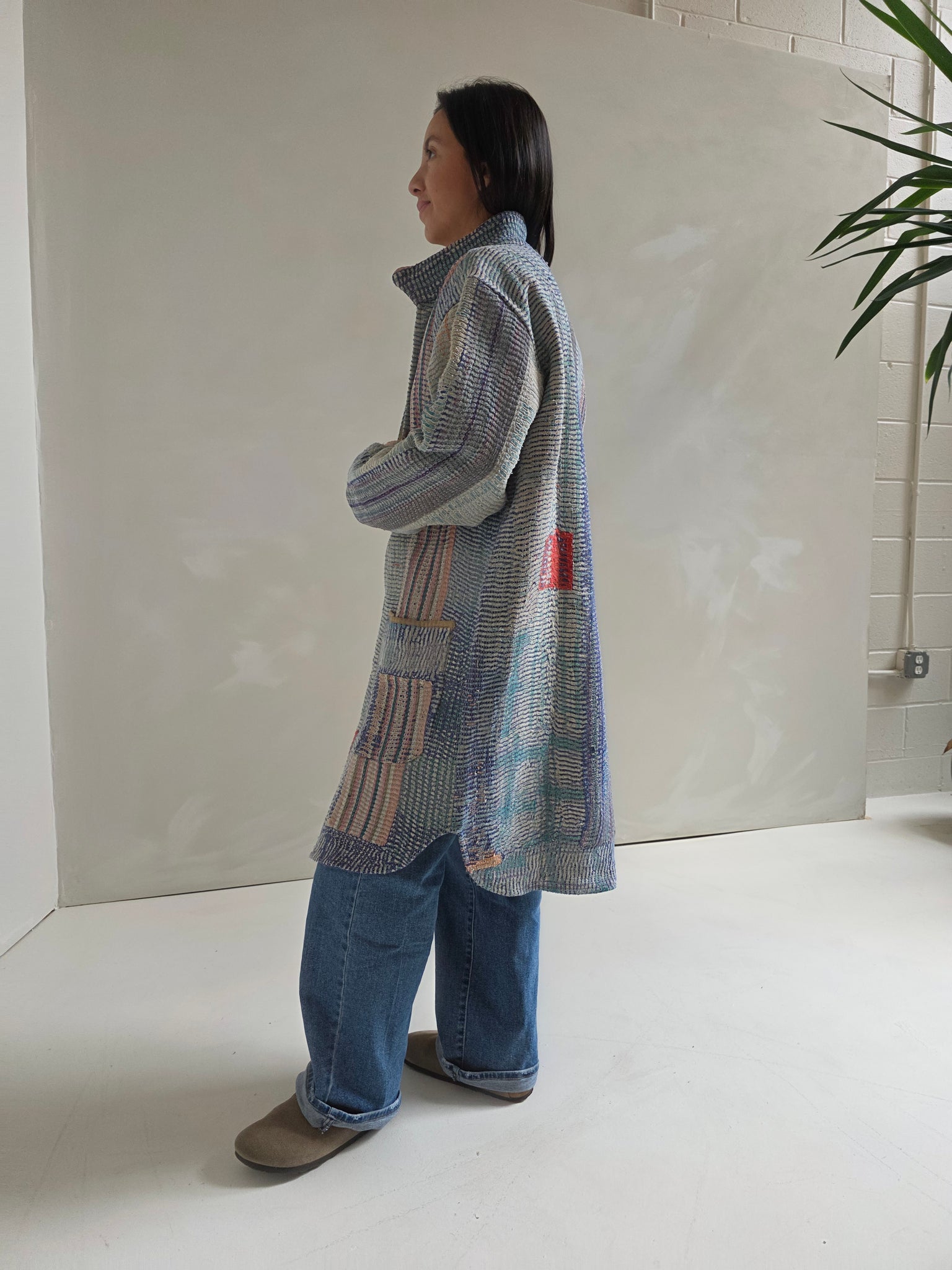 One of a kind, mid-weight jacket made from vintage cotton Kantha. Features a handsewn top-stitch detail for the prettiest texture and lasting durability.