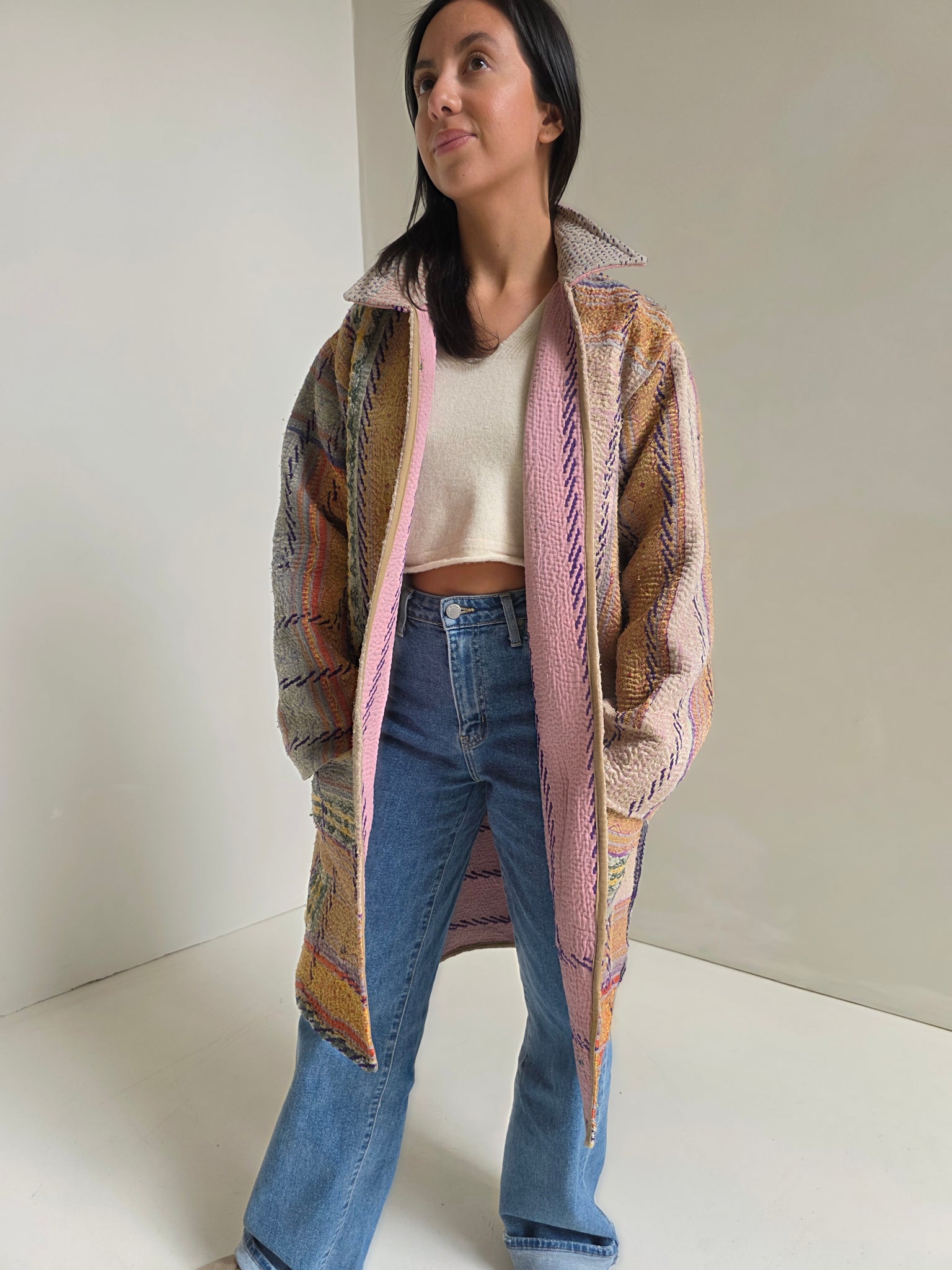 One of a kind, mid-weight jacket made from vintage cotton Kantha. Features a handsewn top-stitch detail for the prettiest texture and lasting durability.
