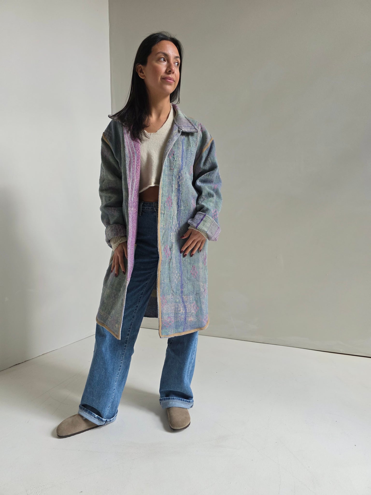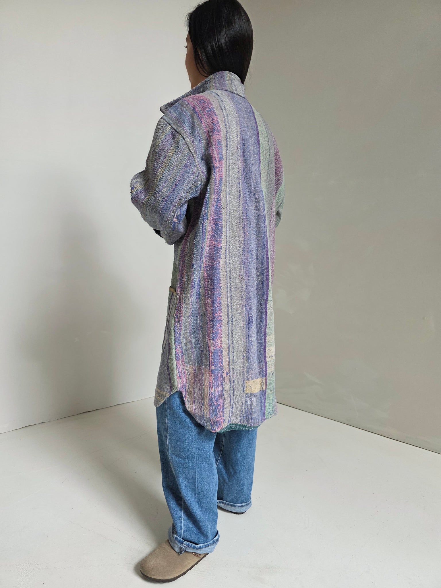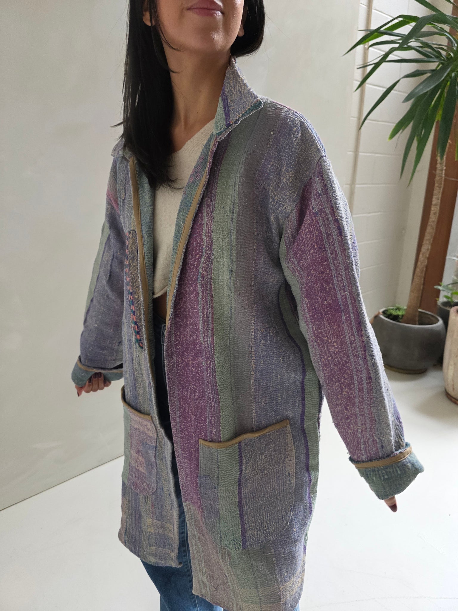 One of a kind, mid-weight jacket made from vintage cotton Kantha. Features a handsewn top-stitch detail for the prettiest texture and lasting durability.