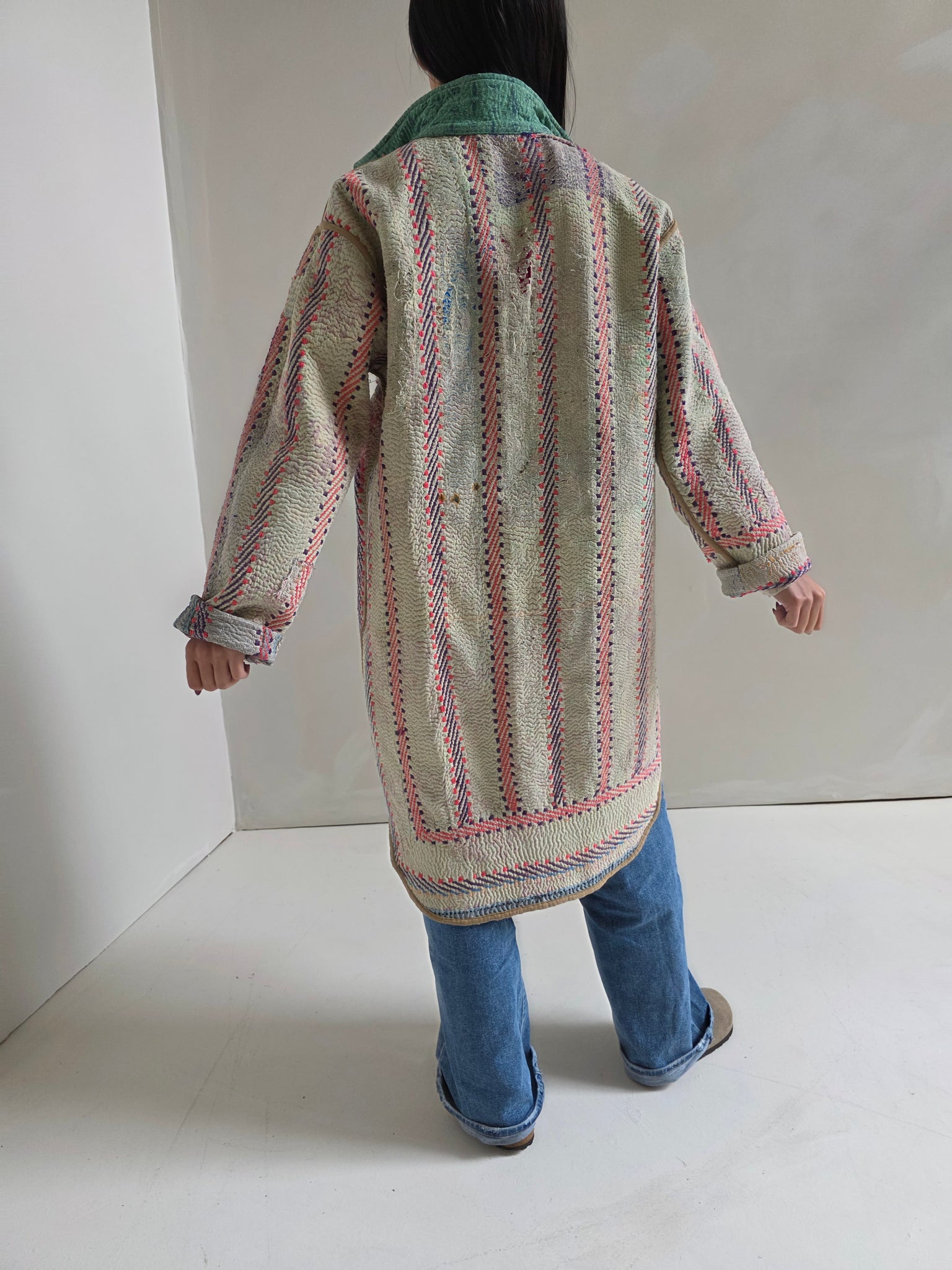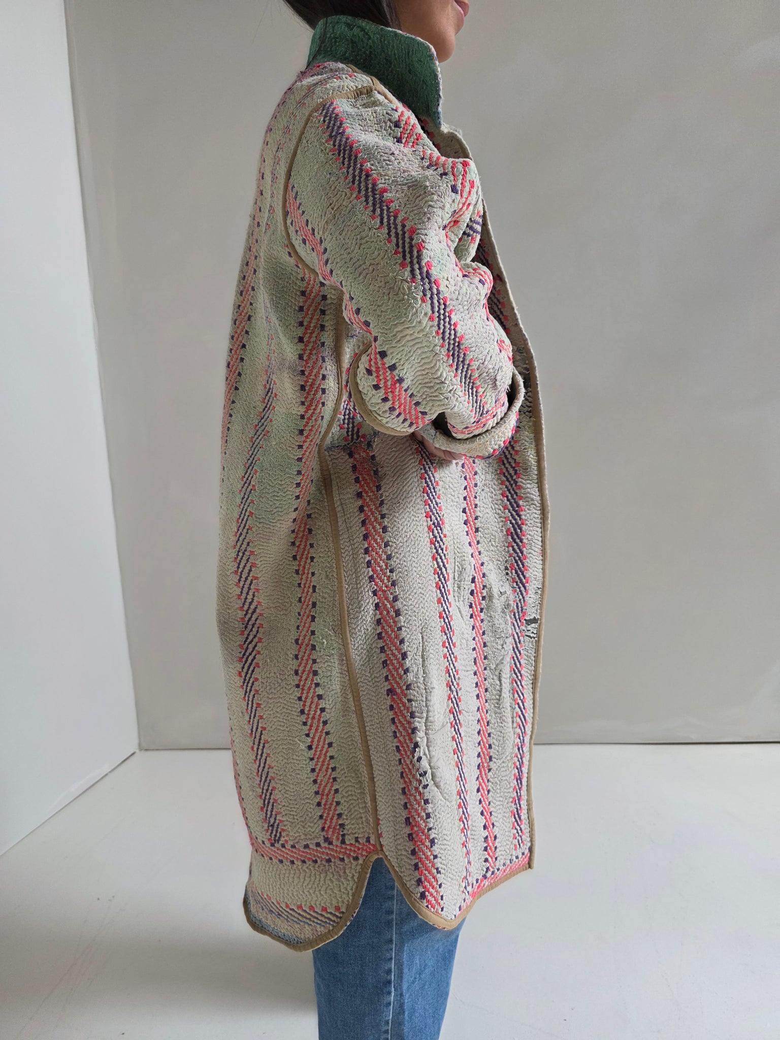 One of a kind, mid-weight jacket made from vintage cotton Kantha. Features a handsewn top-stitch detail for the prettiest texture and lasting durability.